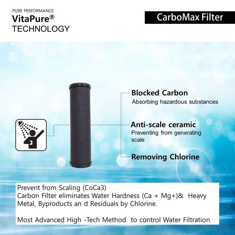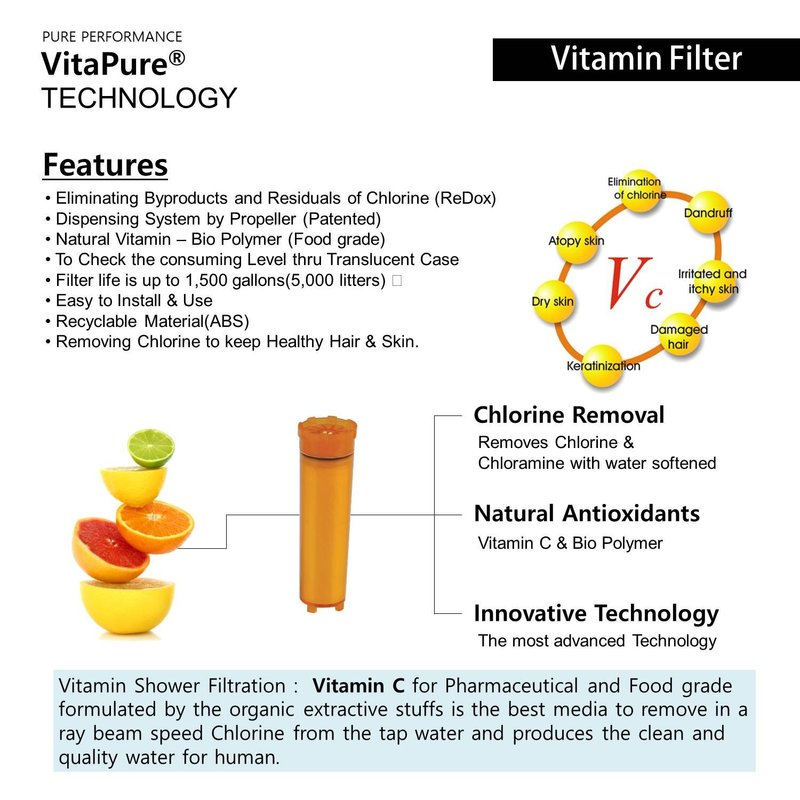 Eliminating Byproducts and Residuals of Chlorine (ReDox) Dispensing System by Propeller (Patented) Natural Vitamin – Bio Polymer (Food grade) To Check the consuming Level thru Translucent Case Filter life is up to 1,500 gallons(5,000 litters) Easy to Install & Use Recyclable Material (ABS) Removing Chlorine to keep Healthy Hair & Skin