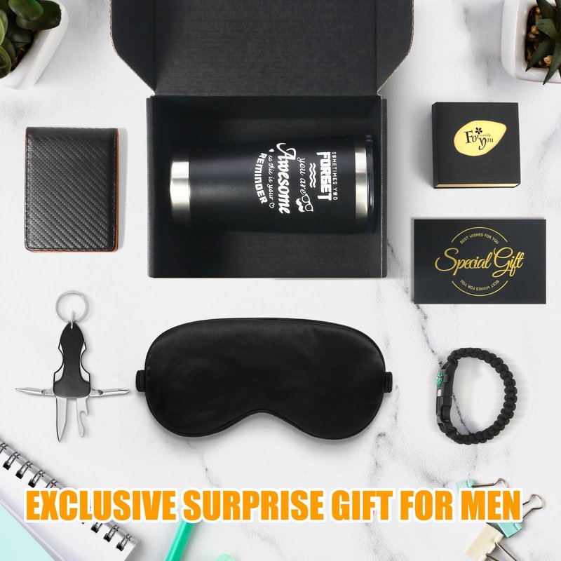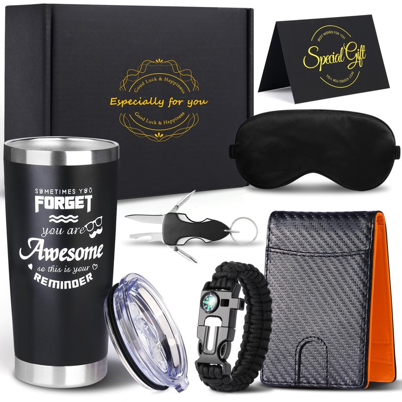 - 😎A Sense of Ceremony for Men:You no longer need to worry about what gift to give to men. We carefully match every gift suitable for men for you, and when combined in this surprise gift box, you will receive √20oz Insulated Tumbler Black√Functional Bracelet√Black Eye Mask√Multifunctional Tool Keychain√Leather Wallet√Handwritten Card√Gift Box,Feeling full of warmth!