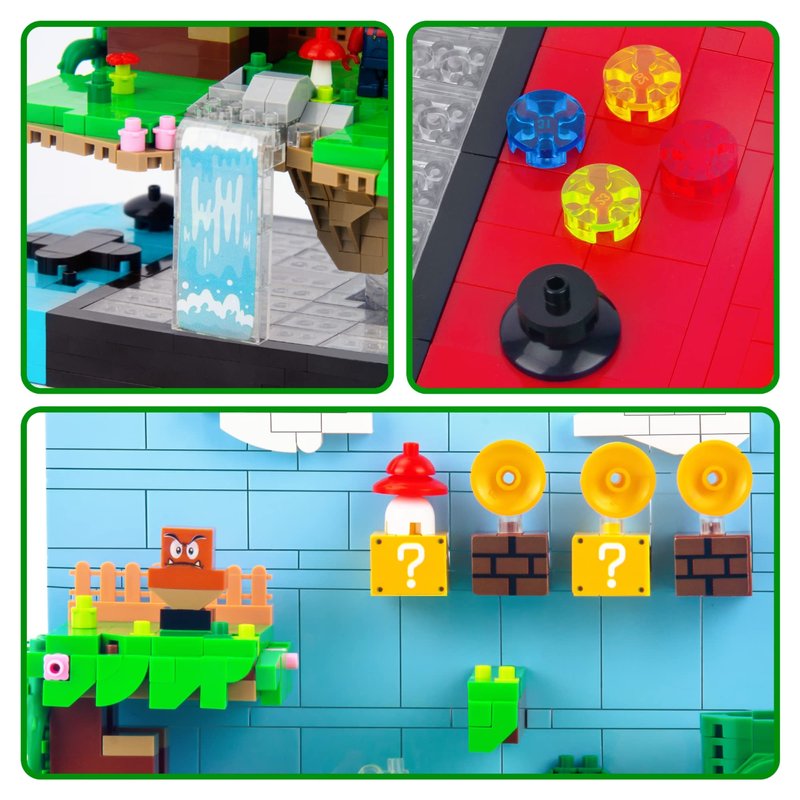 - 【Classic super game brick-built set】:The block set has 1256 pcs, including game table and game scenes:two movable models,plus a buildable sandcastle, waterfall, ladders,tree,peach’s castle, battlefield, cool mountain and lethal lava trouble.It restored famous scenes and characters in games.