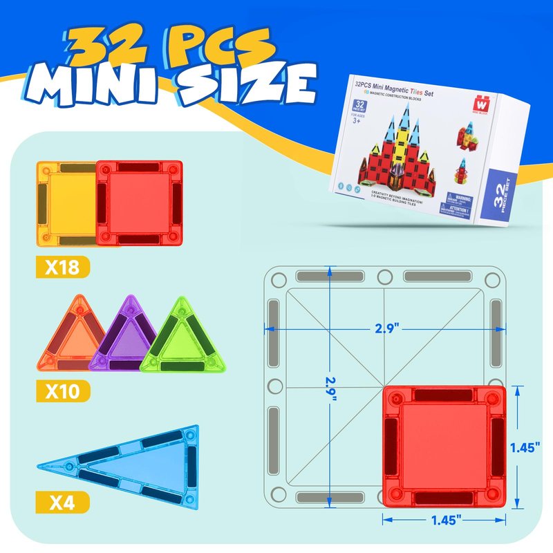 - Mini Magnets, Macro Imagination: Unleash pint-sized creativity with 32pcs mini magnetic tiles in a kaleidoscope of colors; These wee wonders inspire pocket-sized palaces to futuristic fortresses, all fitting snugly in tiny hands