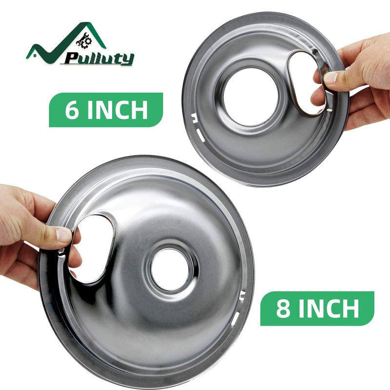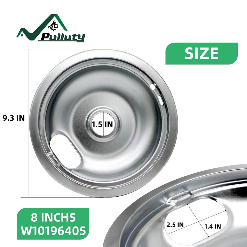 - Includes 2 x W10196406 (6'' chrome plated burner drip pans), 7.45" diameter and 2 x W10196405 (8'' chrome plated oven drip pans), 9.35" diameter. The electric oven drip tray is made of durable chrome plated steel with environmentally friendly plating technology. Silver color.