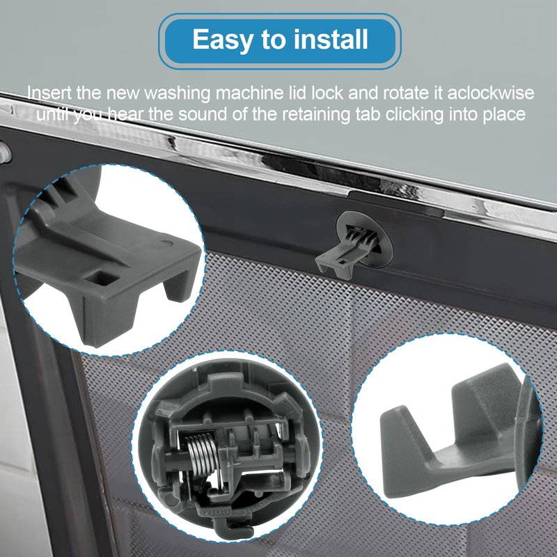 - 【 Cover lock replacement】Easy installation. Turn counterclockwise to disconnect the retaining tab and pull back the old washer door prop cover lock. Insert the new washing machine lid lock and rotate it clockwise until you hear the sound of the retaining tab clicking into place.