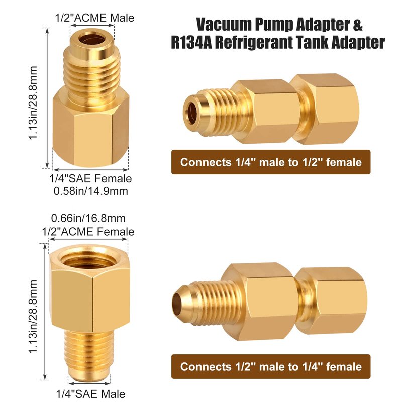 - R134A Refrigerant Tank Adapters: Two sizes are 1/2" ACME female to 1/4" SAE male and 1/2" ACME male to 1/4" SAE female.