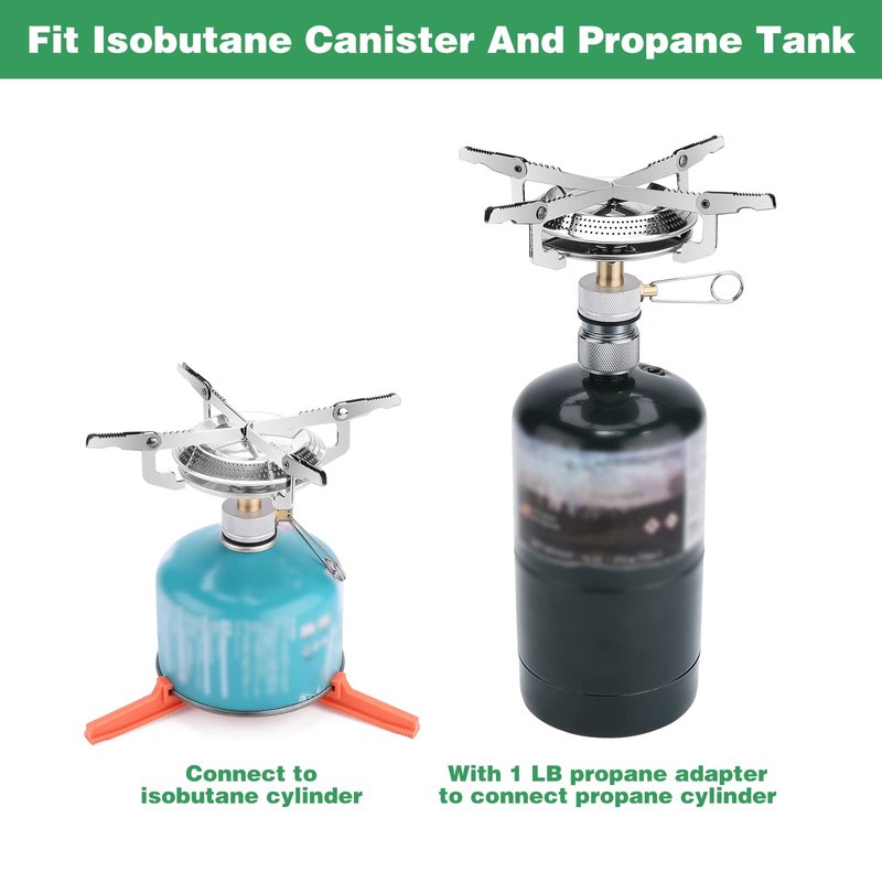 What's included: 1*Portable Camping Stove Burner; 1*Gas Valve 1*1LB Propane Tank Adapter; 1*Storage Bag; 1* Fuel Canister Stand.
