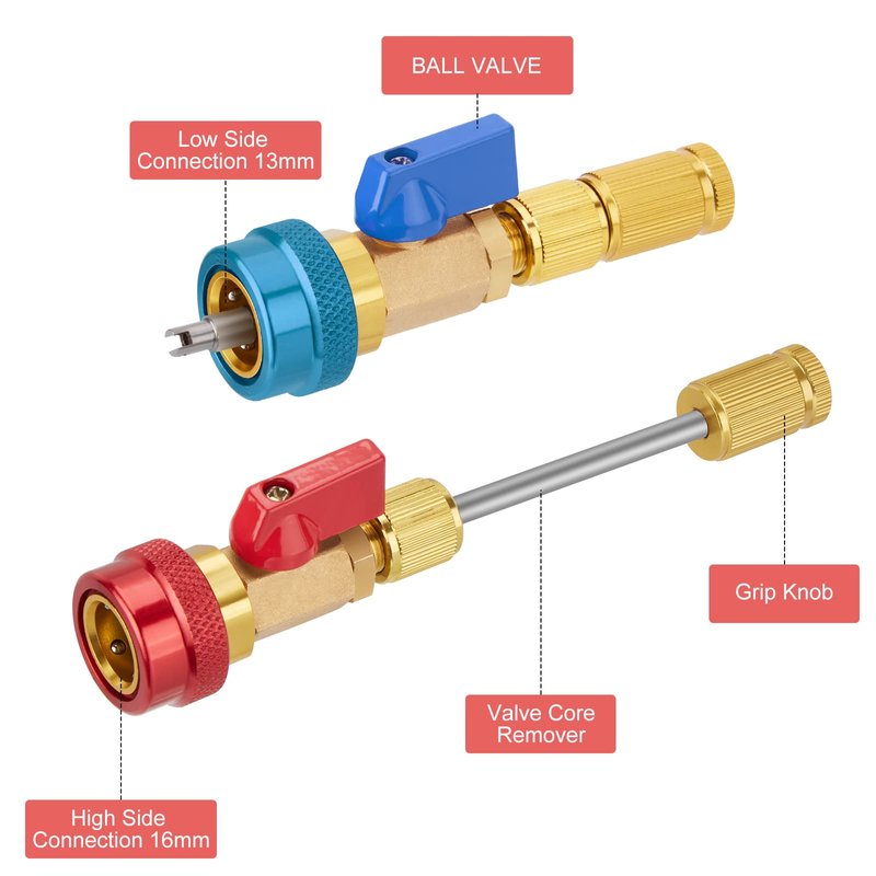 - 🔶Great Design: This valve core quick remover tool is mainly made of brass, the valve rod is made of stainless steel and the red and blue valve is made of aluminumit. It has a ball valve that can be opened and closed in just a quarter-turn. (No Gas Loss). Anti-slip design increase hand friction, prevent all kinds of overpowered valves.
