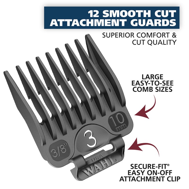- 12 Smooth-Cut Attachment Guards – This 20 piece kit features 12 smooth-cut attachment guards vary in size from 1/16” to 1”, the smooth cut guards helps the clipper glide through thick hair easily without snagging or pulling