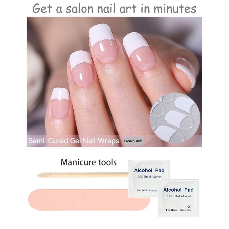 Wahrshei Semi Cured Gel Nail Strips | 20pcs French Glitter Gel Nail Stickers UV | Semi Cured Gel Nail Wraps for Home Nails DIY