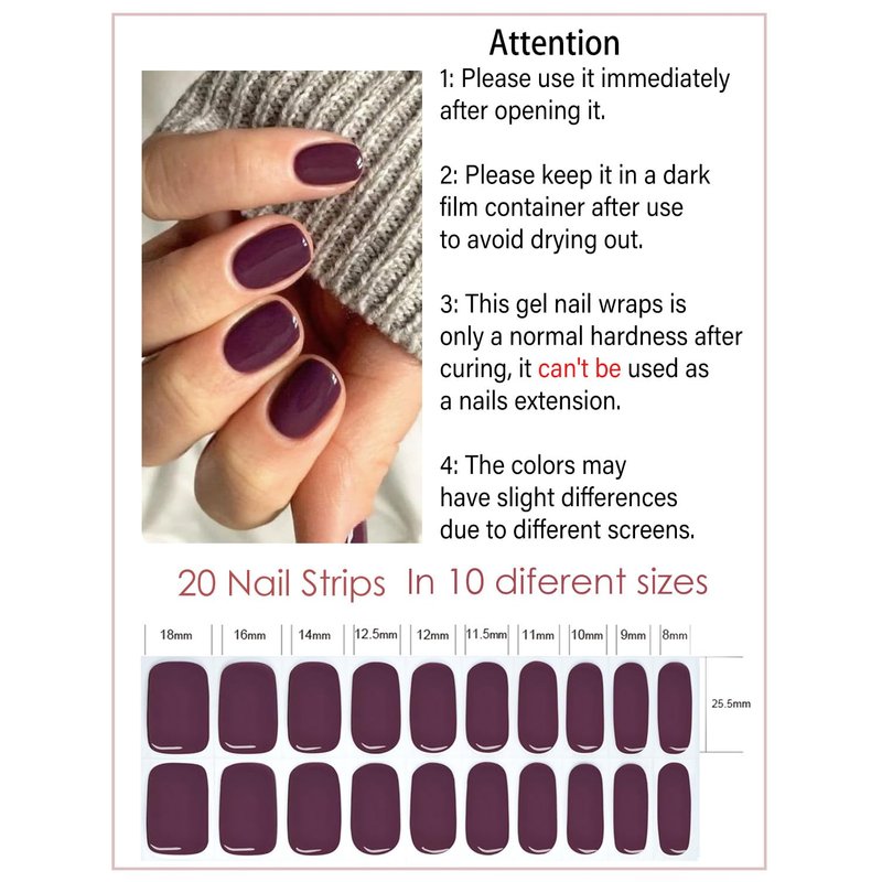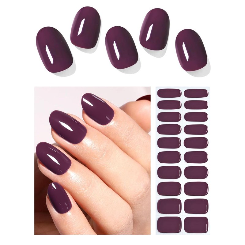Wahrshei Semi Cured Gel Nail Strips, 20pcs Purple Plum Gel Nail Stickers Work with UV, Easy to Use and Remove
