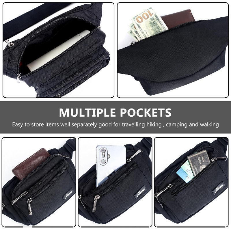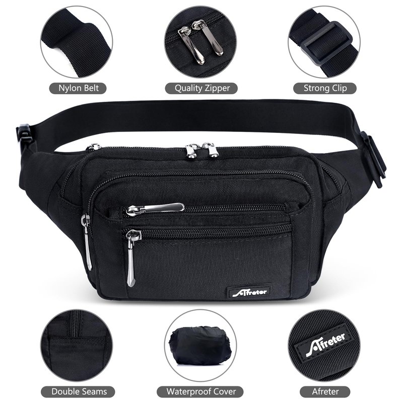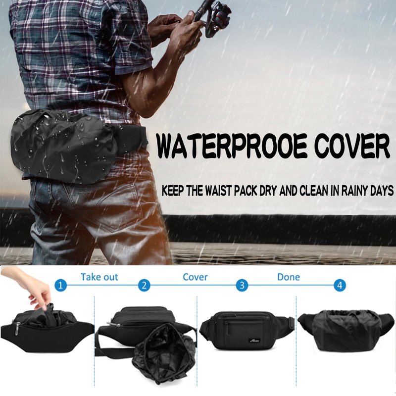 - 【6 MULTI-POCKET DESIGN】Our fanny packs for men & women will keep your hands & pockets free! 5 zipper pockets of different sizes and a hidden zipper pocket design, hidden zip perfect give your valuables extra security, all your needs. The largest pocket can easily accommodate a standard water bottle. A zippered exterior pocket located behind the waist band with Rain Cover it can better protect important items in rainy days.