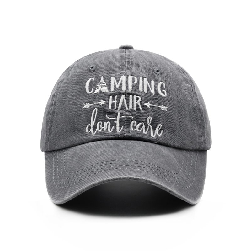 - VINTAGE DISTRESSED EMBRIODERY DESIGN: This cap has lofted embriodered lettering "Camping Hair Don't Care" logo on front that looks larger and bolder