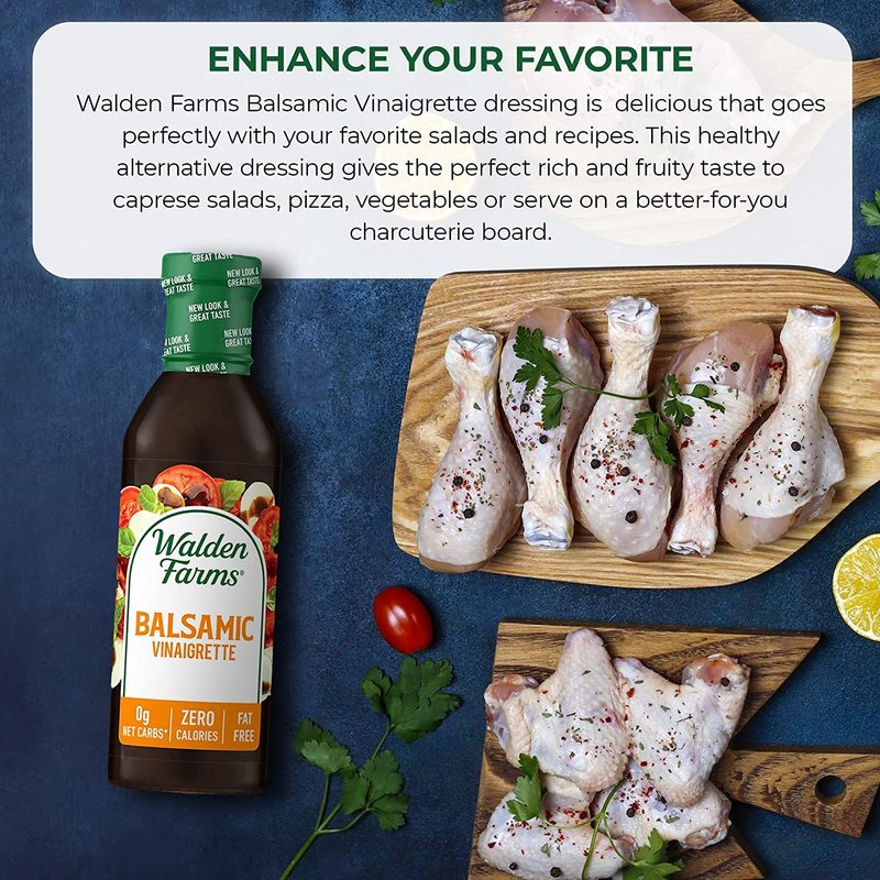 - ENHANCE YOUR FAVORITE - Walden Farms Balsamic Vinaigrette dressing is delicious that goes perfectly with your favorite salads and recipes. This healthy alternative dressing gives the perfect rich and fruity taste to caprese salads, pizza, vegetables or serve on a better-for-you charcuterie board.
