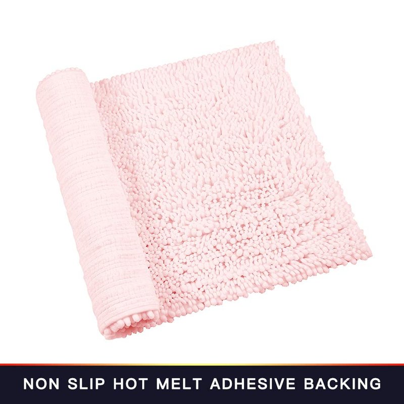 - Non-slip: Skid resistant bottom is made of high quality hot melt. This anti-skid backing keeps bathmat firmly in place. It won't slip or slide. Please place the non-skid toilet rug on DRY SMOOTH FLOOR only. Water under the bathroomrug can cause it to slip. Keep bottom of the bath rug dry.