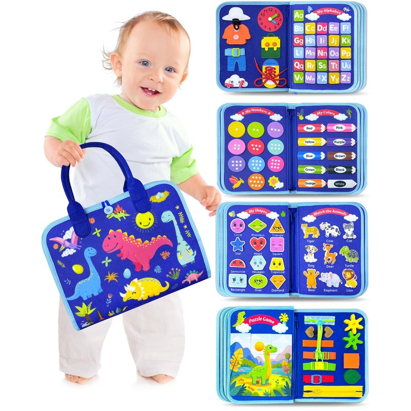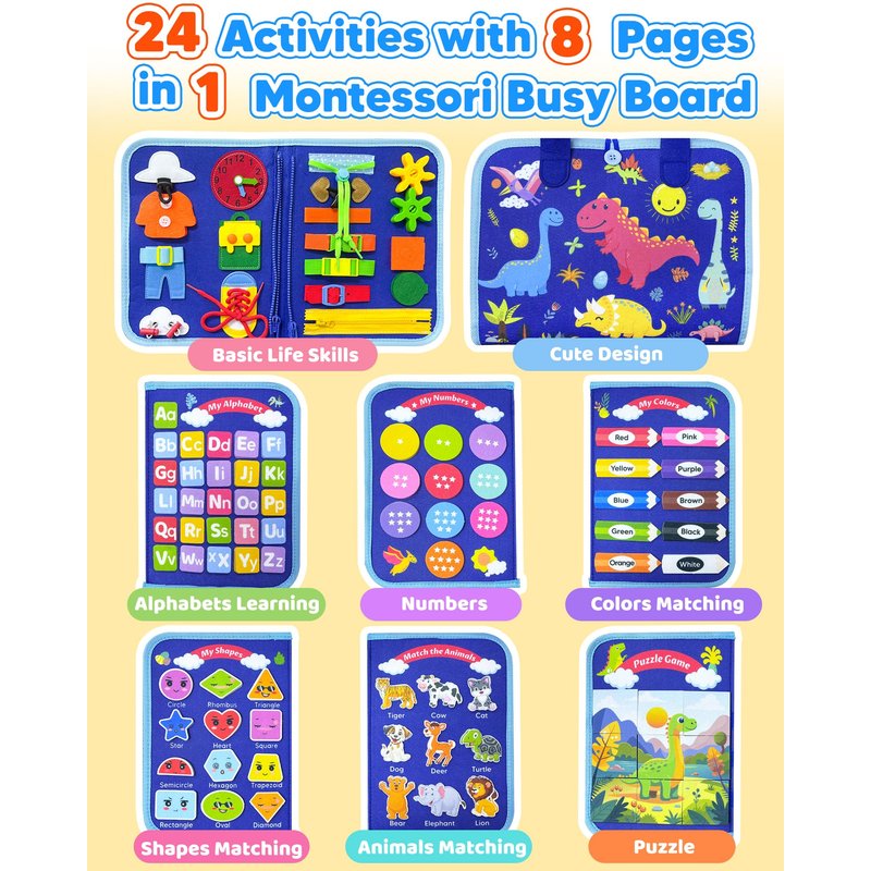 - 8 pages in 1 Busy Board: This Blue Dinosaur busy book has 8 activity pages and contains 24 learning activities in the basic dress skills, letters, numbers, shapes, colors, matching animals, and dinosaur themed puzzle game, keeping your little ones engaged for a long time!