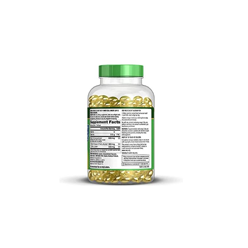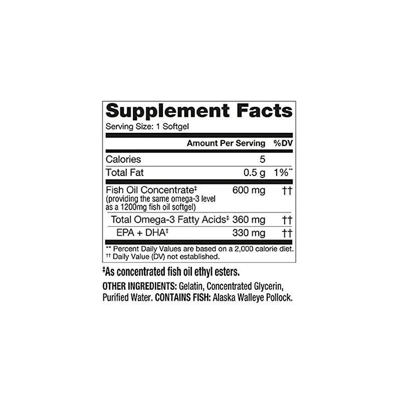 Half-sized fish oil softgels. Supports heart & vascular health. USA wild caught Alaskan. Half-sized fish oil** softgels. Supports heart & vascular health*. USA Wild Caught Alaskan Fish. With 330 mg EPA + DHA**. Just ONE small softgel per day. Same omega-3** levels as a 1200 mg fish oil** softgel, in a concentrated formula **as concentrated fish oil ethyl esters *These statements have not been evaluated by the Food and Drug Administration. This product is not intended to diagnose, treat, cure or prevent any disease. Made in United States. 100% satisfaction guaranteed. As a dietary supplement, take one softgel daily with a meal. For adults only. Consult your doctor before taking any supplement, particularly if you are pregnant or nursing. For optimal storage conditions, keep in a cool, dry place with cap tightly closed. Avoid excessive heat or freezing.