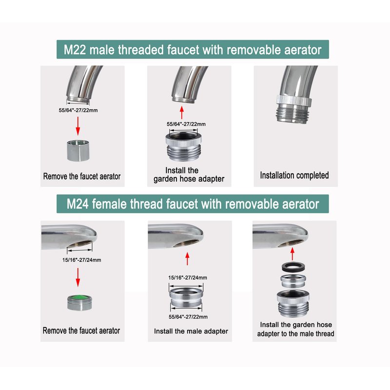 - Thread: Please note that this adapter is only for faucets with removable aerators. Suitable for 55/64"-27 male faucets with removable aerator, if your faucet is a 22mm diameter male faucet, please connect directly. If your faucet is 24mm female thread, it can also be used, we include a 15/16"-27 female thread adapter in the package.