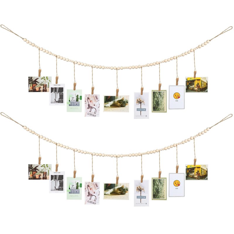 Wall Hanging Photo Display with Wooden Beads Garland 4 Feet Boho Collage Picture Frame DIY Picture Photo Frame Set with 9 Wood Clips for Rustic Country Home, Office Nursery Room Decoration(2 Pieces)