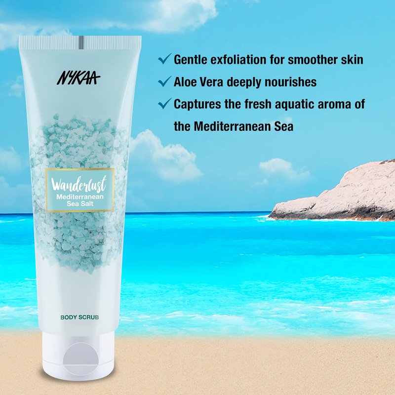 - Wanderlust Bath and Body Mediterranean Sea Salt Body Scrub gently buffs away dead skin cells to reveal smooth and soft skin.