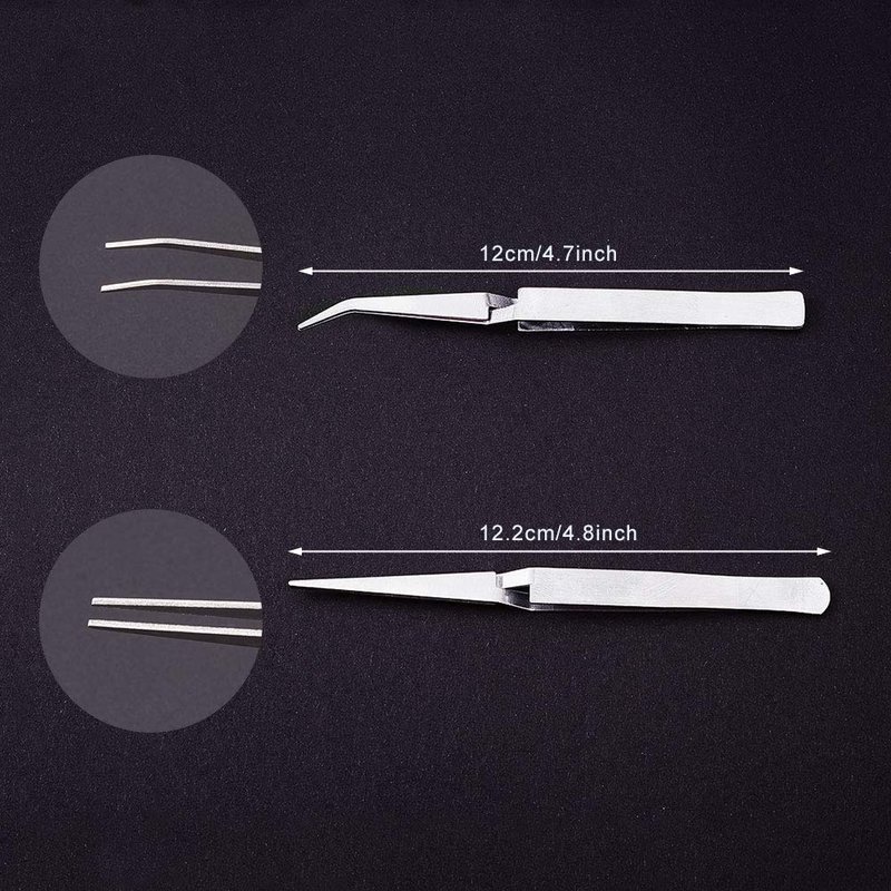 - PACKAGE INCLUDED -- 6pcs tweezers, including 3pcs straight tip tweezers and 3pcs bent tip tweezers. Size is about 12 cm/4.8 inch in length.