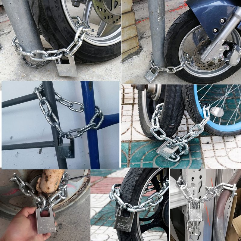 Security padlock and full chain plating anti-rust corrosion resistant and waterproof,prevents saw blade and tool cutting,Chain is made of hardened steel with excellent chain strength provide the highest level of protection for items, so it protects your precious items from theft.