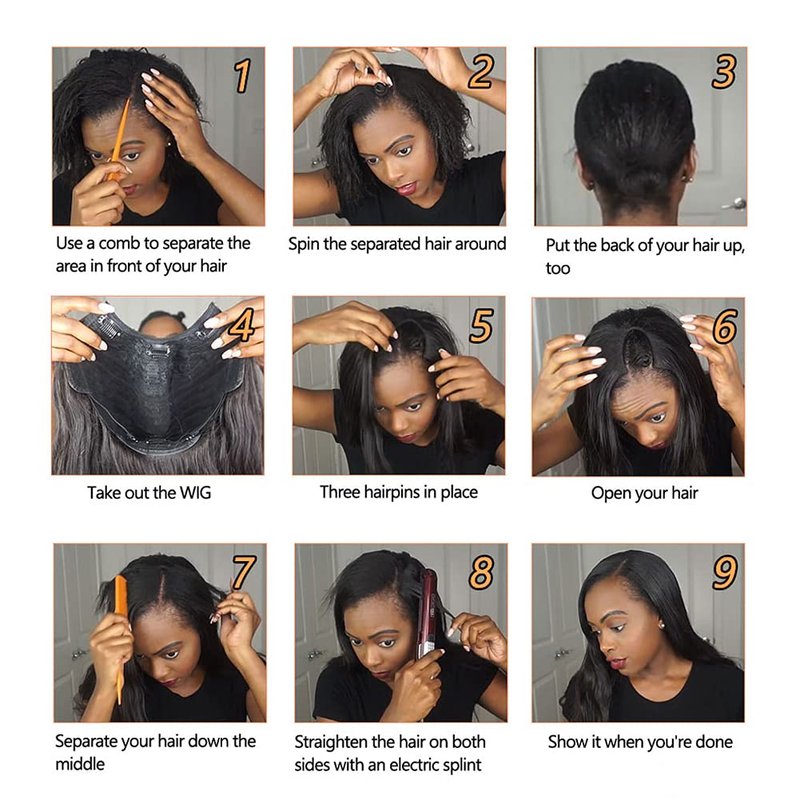 - Put your own hair on the top to cover the edge of the u-part human hair wig. And you can style it for more natural