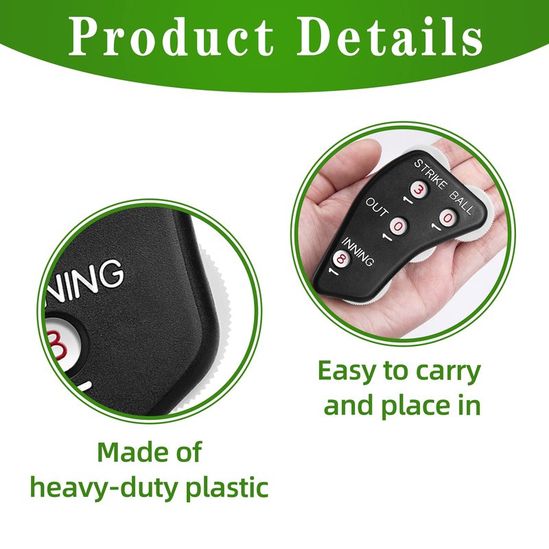 3. Durable materials: Quality pitch count tracker, Durable, Lightweight, small size, easy to carry and store, in the pocket is very convenient. The wheels will turn nice, when you give a solid click then you can track pitch count and number of outs without feeling like you have to look at it every time.