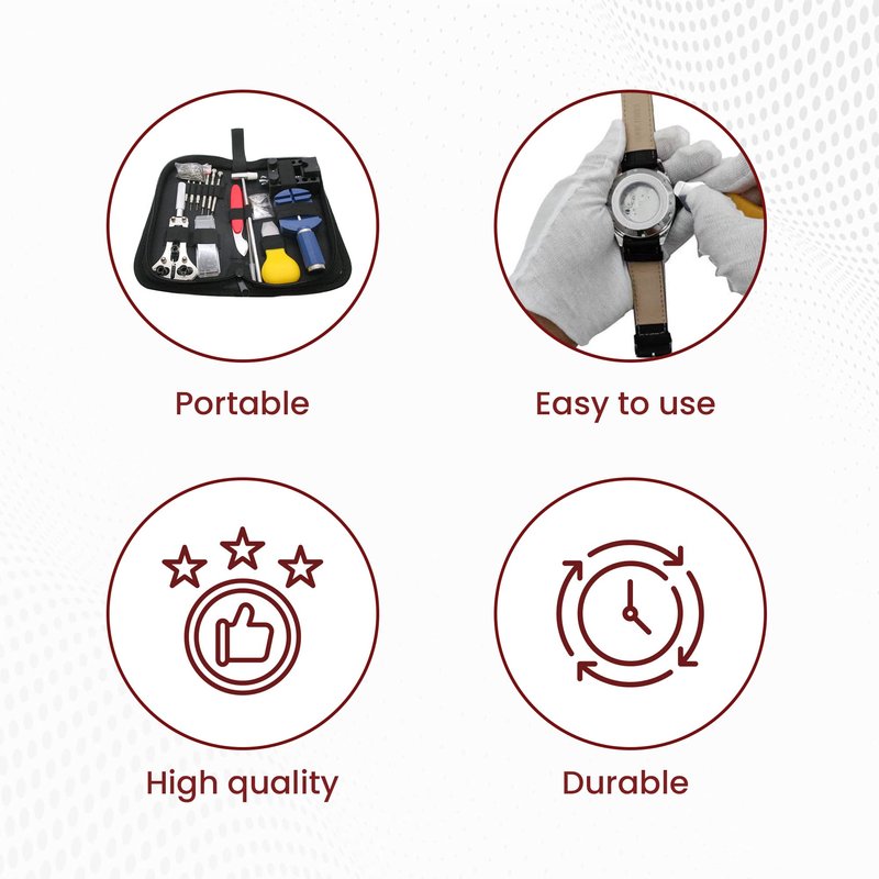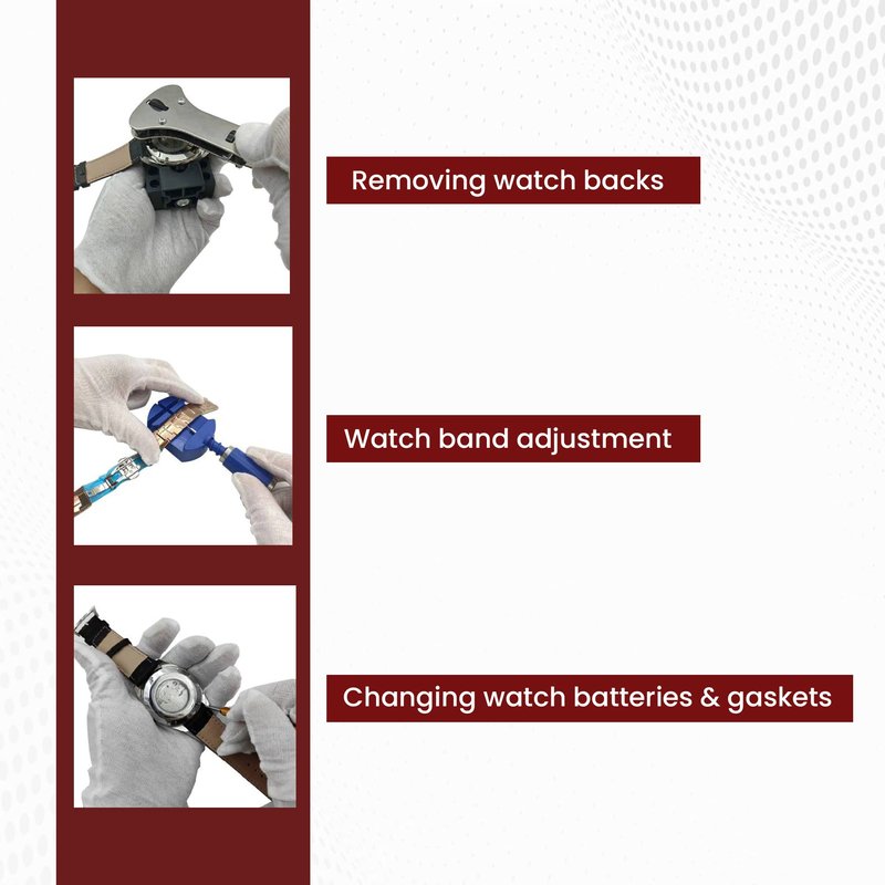 - Our comprehensive watch repair kit consists of all the essential watch repair tools, including an adjustable watch case opener, case opener pins and knife, tweezers, spring bar tool, hammer, link remover tool, watch case holder, watch back opener, screwdrivers, pin punches and more.