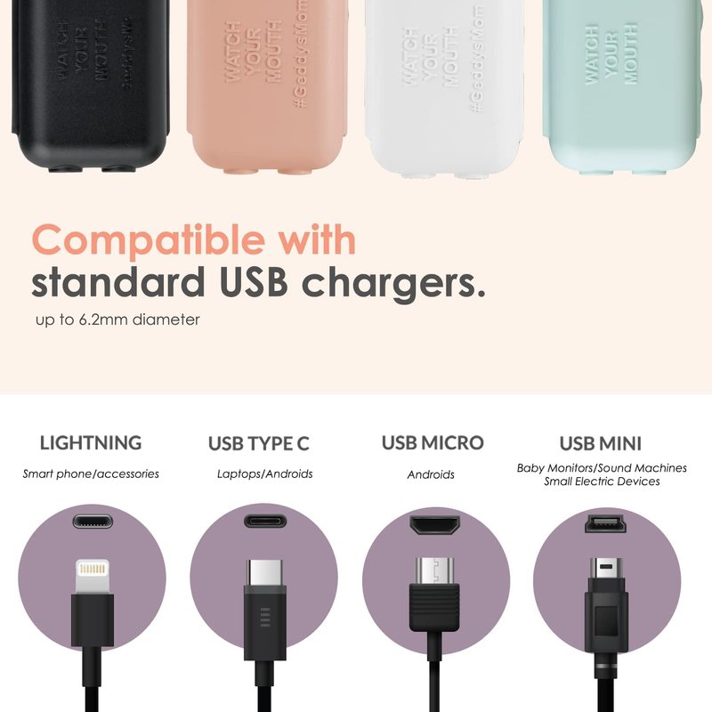 - COMPATIBLE WITH MOST USB CHARGERS - With all the devices we own today, USB safety is more important than ever! Watch Your Mouth clips on and encapsulates the free metal connector end of most standard USB cords for personal devices, including Lightning, USB-C, Micro, and Mini USBs with cords under 6.2mm in diameter. This includes flat charger cables and off-center connectors.
