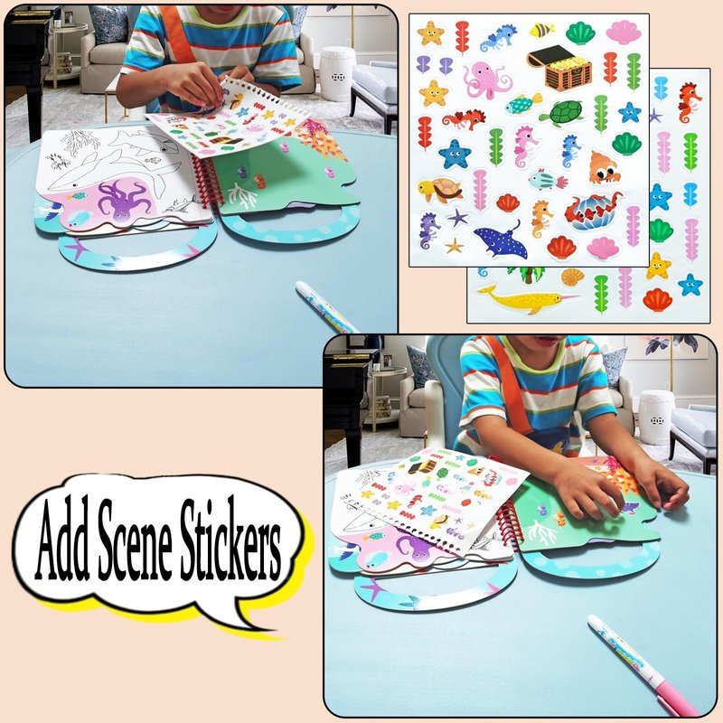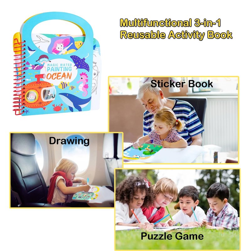 - 3-in-1 Multifunctional Book: The book set of Paint with water, Stickers and scenes page, Game of find difference page. Don’t worry about how to clean ink and stains. Children can enjoy coloring and create experiences.