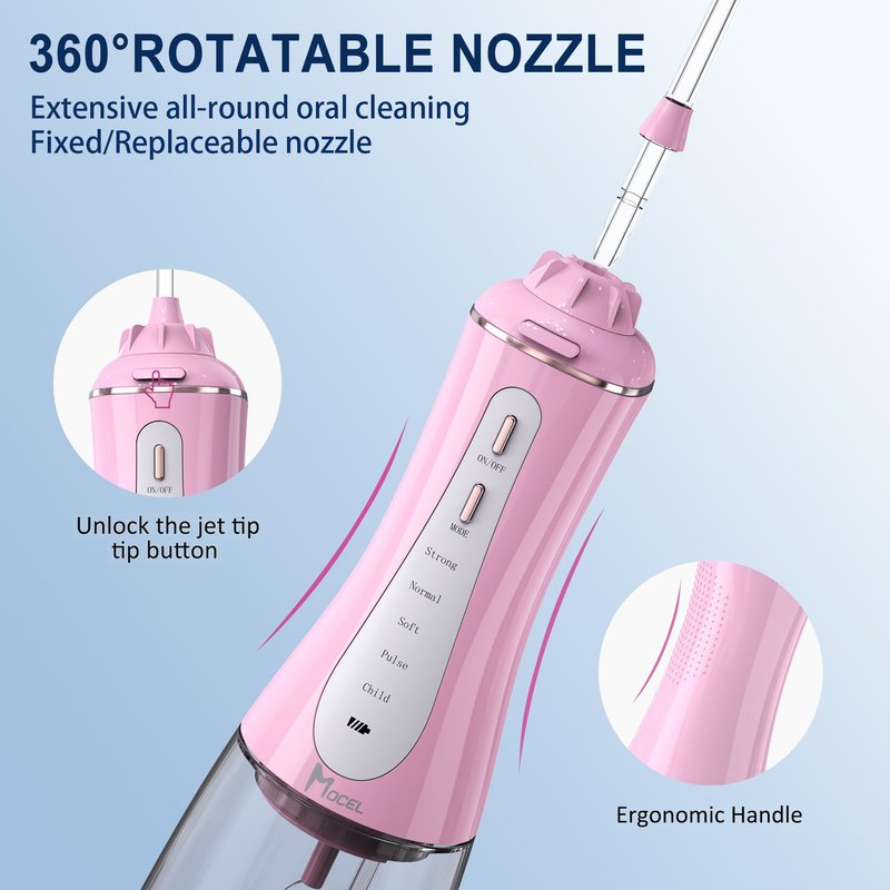 - 【5 Different Modes & Newest Design for Family】 Are you looking for a good dental water flosser for your multiple family members? Mocel portable cordless tooth pick has 5 cleaning modes and 6 nozzles: Strong, normal, soft, pulse and child for family members. Removing up to 99.9% plaque from dental areas for improving gum health. The soft mode and child mold work perfectly for child and sensitive gums. The design looks elegant and it owns small waist shape which can be hold tightly.
