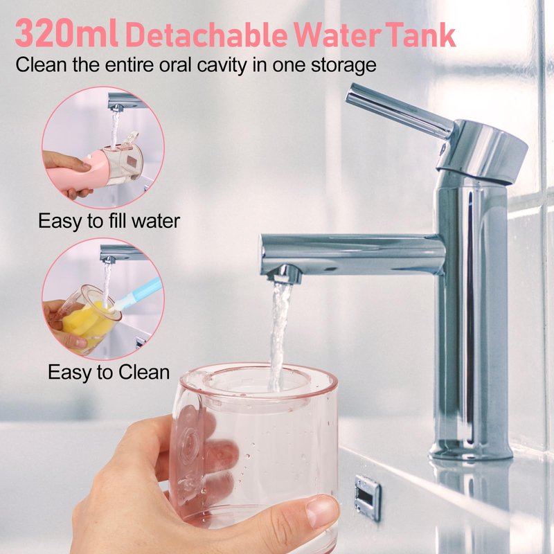 - 【Easy to Clean & 320ml Large Capacity】The large capacity 320ml water tank of the flosser does not need to be filled repeatedly, a single filling is sufficient for cleaning the entire mouth. The removable water tank with two filling options make this portable water dental flosser more convenient to use and the open visual tank makes cleaning even easier.