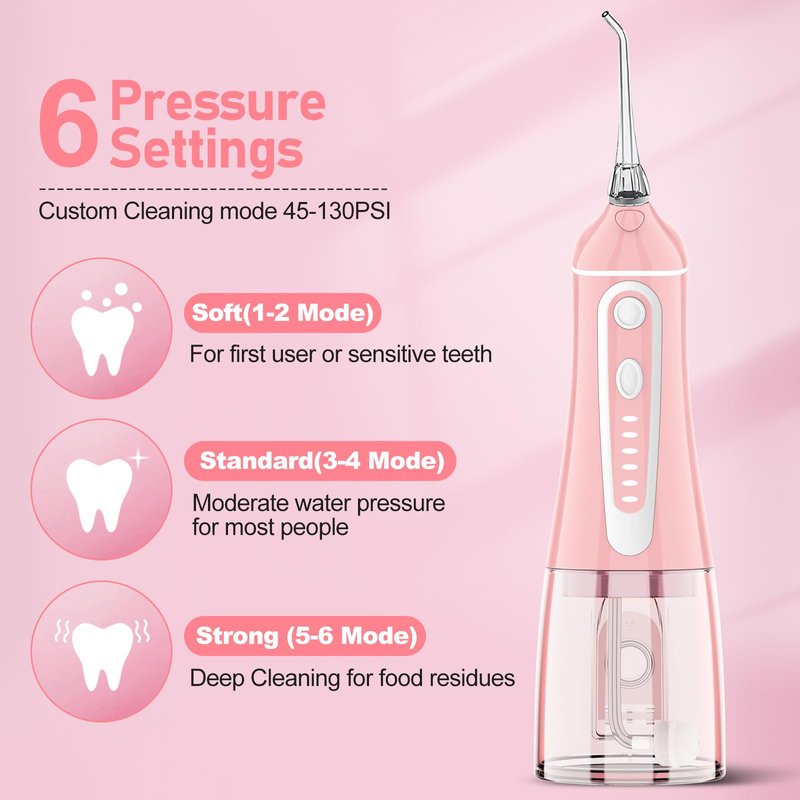 - 【7 Modes & High Frequency Pulse】:Grinest power dental flosser uses high frequency pulses to deeply clean the teeth and mouth and is designed with 3 cleaning functions, soft, standard and powerful, each with 2 levels of water pressure, which equates to 6 modes. A special mode is the massage in dental flosser, which automatically circulates the water pressure from low to high to give a comfortable cleaning experience.