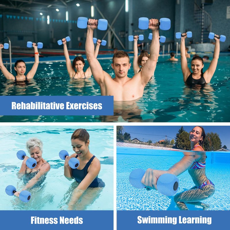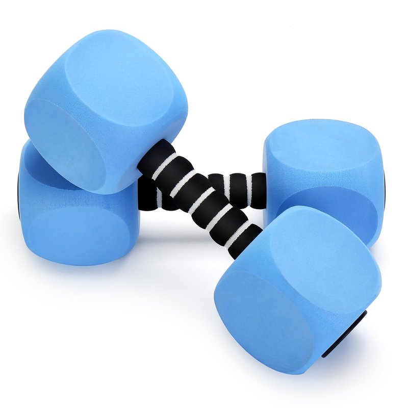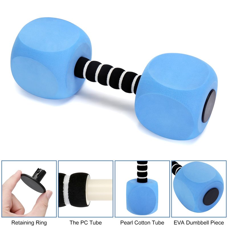 - The aquatic dumbbells for water aerobics is a perfect aquatic fitness tool, designed in modern & ergonomic Design. EVA foam cushion padded around the hand bar, offering a more comfortable & anti-slip grip. Medium diameter fit for women adults. Buckle Design is for freely assemble.