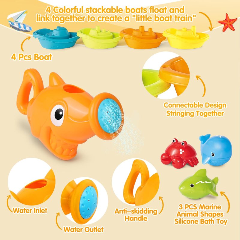 - 16PCS Rich Configuration Baby Bath Toy Set: Brightly colored items catch baby’s attention and stimulate their imagination. The water table bath toys set includes 4 floating boats, 8 stacking cups, 1 shark water can & 3 marine animal silicone toys, which perfect for making bath time fun! Stack, scoop, strain, spill, pour & more, our floating bath toys will turn every bath time into a joyful aquatic adventure!