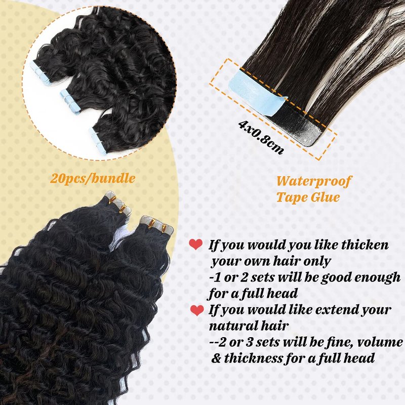 - ❤Tape in Water Wave Hair & Fashion:Human Hair Extensions Tape in Wavy, Length:14-24 inches,2.5g/pc 20pcs/50g/pack. It is recommended to buy 1-2 packs for thick hair, 3-5 packs for thin hair.14-24 inches are available. Hair extension is the same as our own hair, have its life ,which need more careful than our own hair to prolong the hair extensions using time.