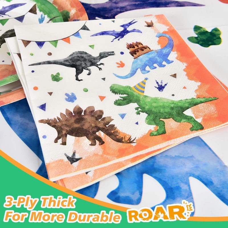 - 【PACK CONTENT】- Include dinner plates, dessert plates, napkins and paper cups. You would have 64 pieces dinosaur party supplies at one time.