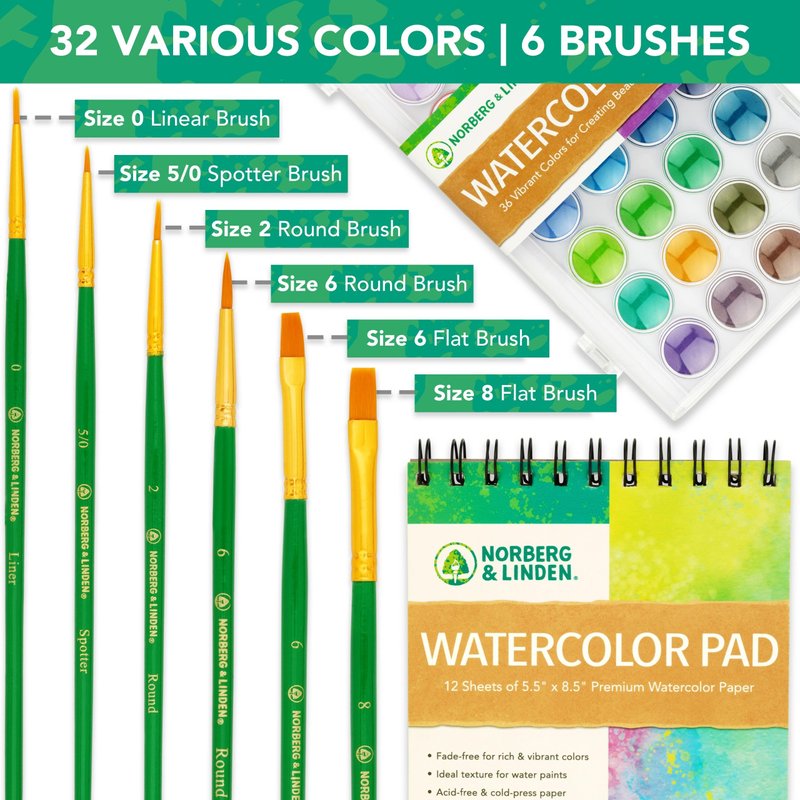 - WATERCOLOR PAINT SET - Opaque, rainbow art watercolor palette Set Includes 36 painting cakes, 6 brush sizes, and 5.5 x 8.5 watercolor paper storage.