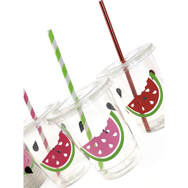 Serve drinks in these adorable watermelon party cups! Each set includes 12 clear soft plastic 12 oz disposable drinking cups with handmade vinyl decals, clear plastic straw slotted lids, and coordinating assorted paper straws. Designed & Handmade in Oregon, USA.