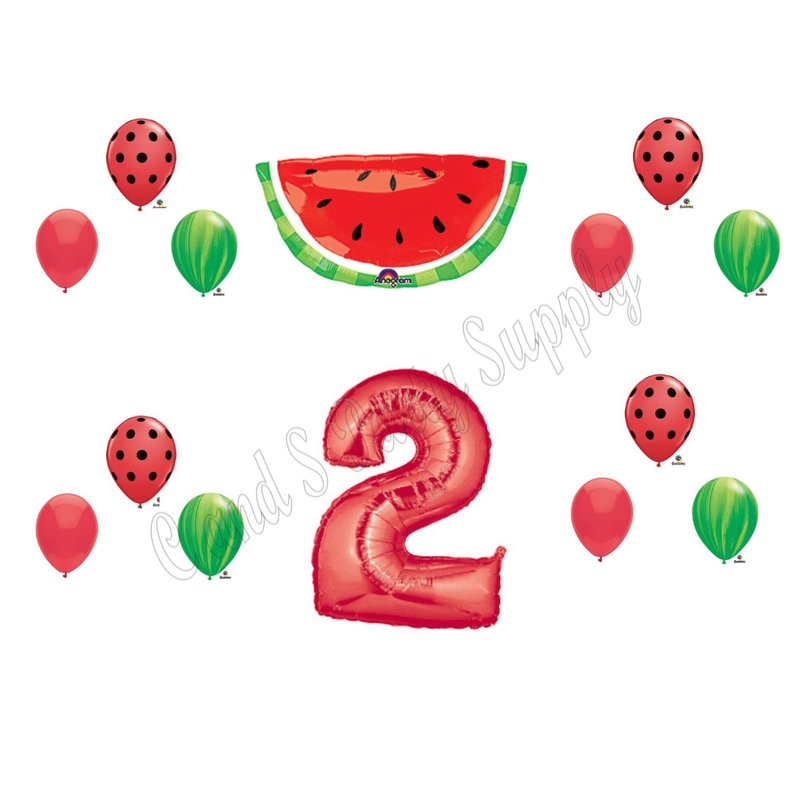 A 14 piece 2nd Birthday Watermelon Birthday Party balloon decorating kit! Fun balloons to display at your 2nd birthday party! You will receive with this kit: One (1) 32" XL Red Watermelon slice mylar shape balloon. One (1) 40" Red number 2 mylar shape balloon. Twelve (12) 11" Coordinating 11" latex balloons...4 red with black polka dots, 4 green agate (marbled look) and 4 watermelon red. All balloons are new and shipped uninflated. Just add helium!