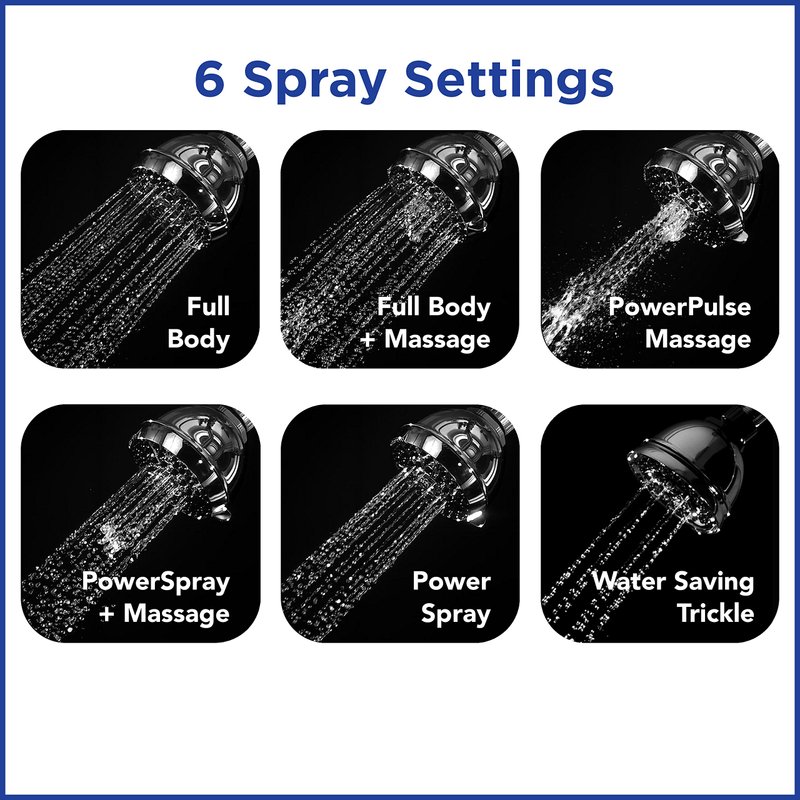 - 6 SPRAY SETTINGS: This powerful shower head offers a range of modes to meet your needs including full body spray, PowerPulse Massage spray, power spray, and more