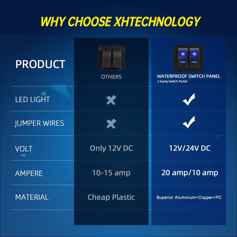 - [Waterproof Switches & Aluminum Panel]: The item is made of waterproof switches and aluminum panel, which is sturdier and more durable than plastic panel. The item has a unique technology in the waterproof structure. The ultra-thin silicone film prevents water from entering the inside of the switch panel, ensuring the inner cavity is dry, avoiding short circuits, and making the boat rocker switches safer during use.