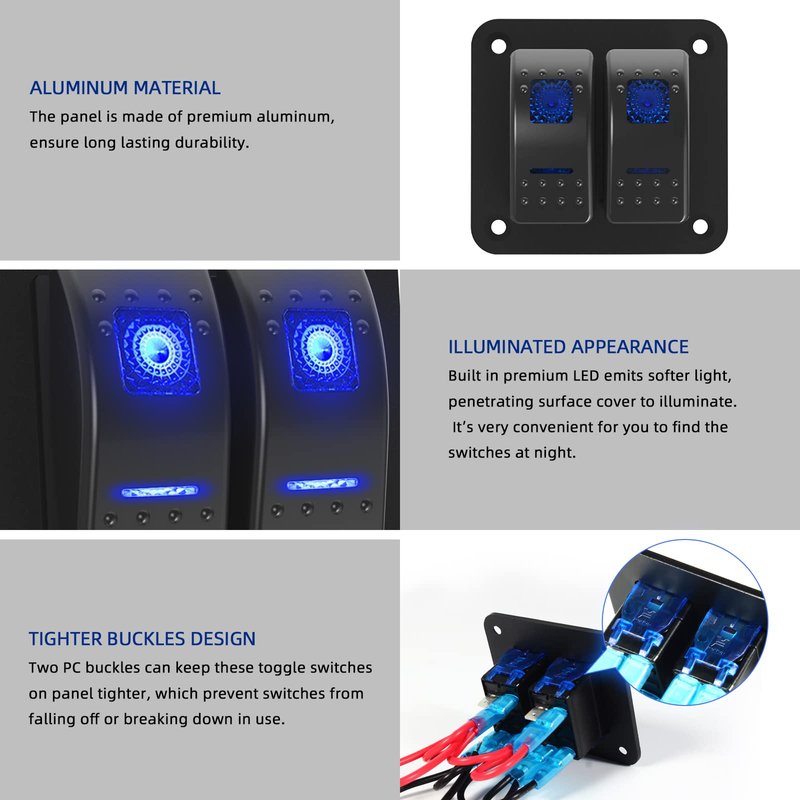 Waterproof 2 Gang Aluminum Toggle Switch Panel, 12V/24V Rocker Switch Panel, On-Off Car Boat Switch, Blue LED Pre-Wired Switch Panel for Marine Boat Automotive Car RV Truck Vehicles