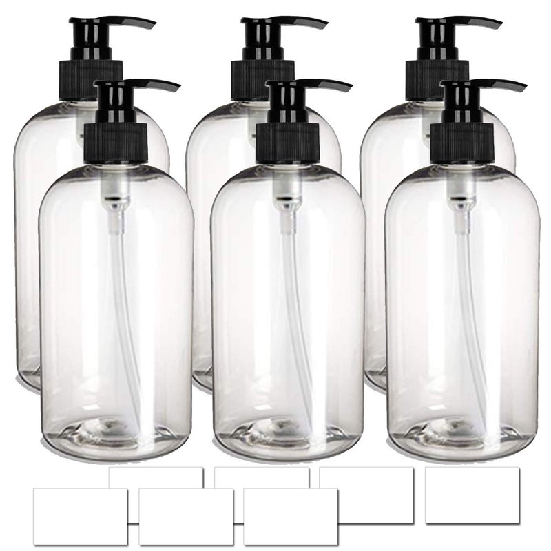 Waterproof Empty Bottles 16oz for Shampoo Conditioner Body Wash Plastic PET with White Pump Dispenser, Clear, Set of 6