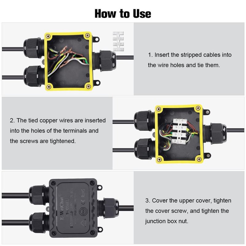 - Junction Box Specifications: One in and two out, and is delivered in a four-position terminal block. Internal size: 71 x 56 x 29.3mm/2.79" x 2.2" x 1.15"(L*W*H). Terminal block current:40A. Terminal block voltage: AC 450V. Available wire diameter: Φ5-9mm, Φ9-12mm, Φ10-14mm. Cable specification: 0.5-6.0mm². Waterproof protection level: IP68(IPX8:4M,120H). Package list: 2pcs(2 junction box+2 four-position terminal block+8 nail+ 18 Waterproof rubber ring+1 screwdriver)