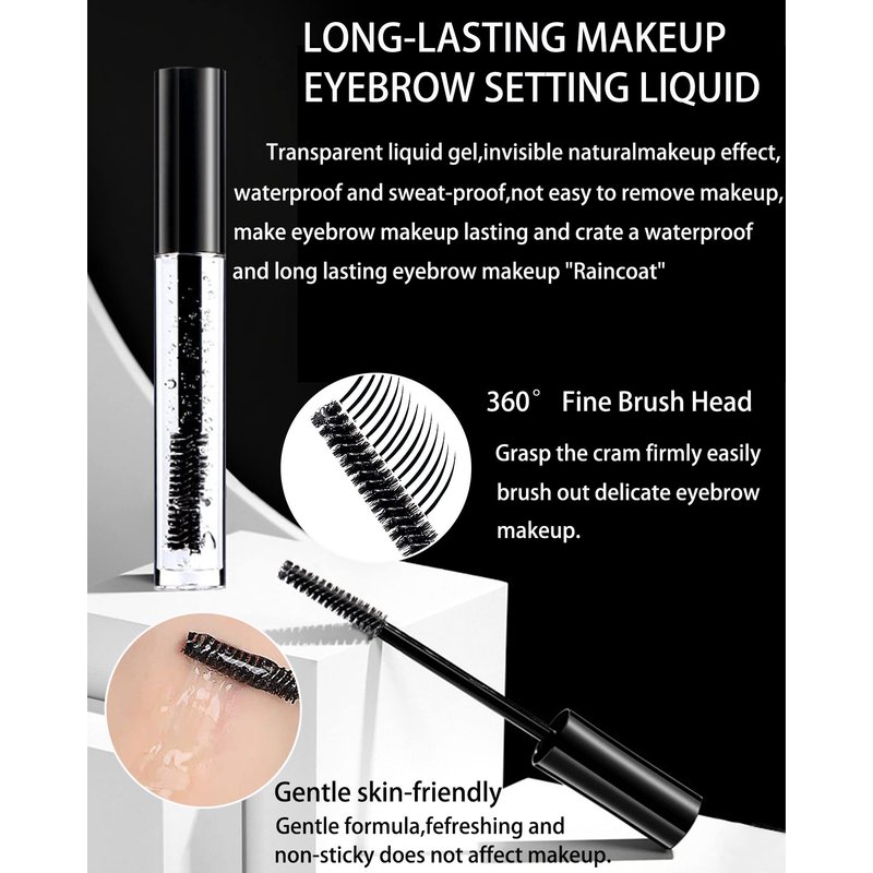 - Clear Eyebrow Setting Gel - The eyebrow Liquid is a clear setting product has even texture, create 3D natural and perfect eyebrows. When brushed through the natural eyebrow adds thickness, volume, texture. Make your eyebrow makeup looks more three-dimensional. It is brow makeup "raincoat", long lasting.