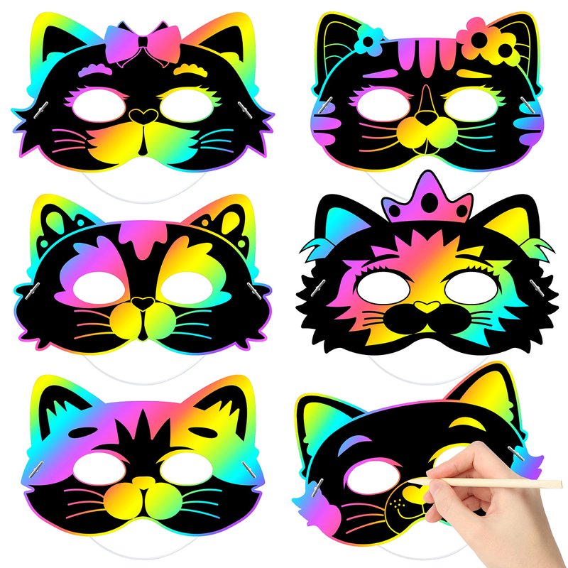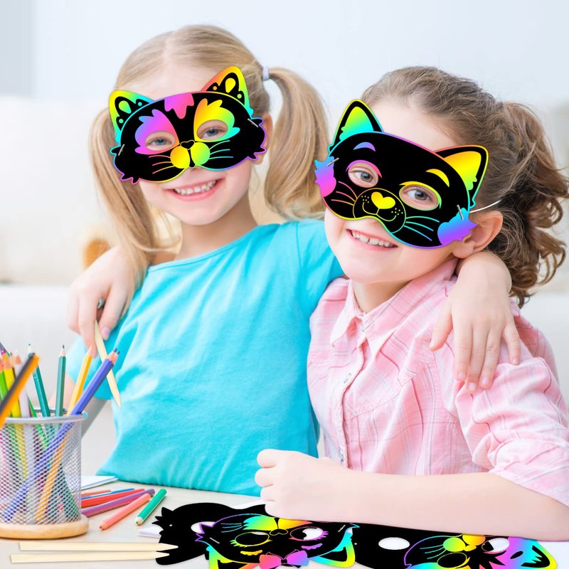 WATINC 24Pcs Cats DIY Scratch Masks, Animal Scratch Paper Mask Art Set for Kids Birthday Party Favors, Halloween Painting Craft Kits Cat Dress Up Costumes Coloring Activity for Boys Girls