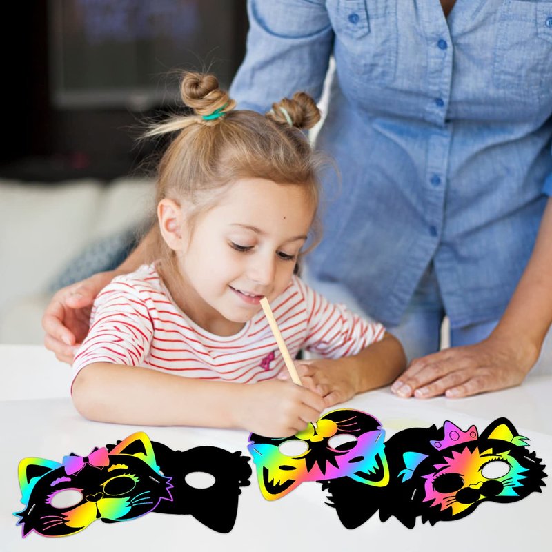 - Use Easily: First, you need to prepare set accessories for cat scratch mask DIY; Then, draw your own pattern by scratching on the party masks for girls and boys with a wooden stylus; Finally, when finished, you can install the elastic band on the mask and start cat party games with friend.