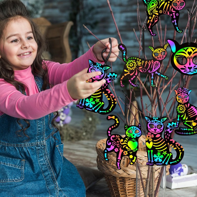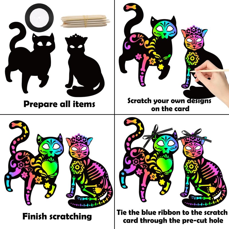 • Easy to Play: Choose your favorite skeleton cat and use your imagination, then gently scratch out the pattern with a wooden stick and the card will come out in a brilliant of colors! Each scratch card has pre-cut holes that can be hung with black ribbon to decorate your Halloween party!