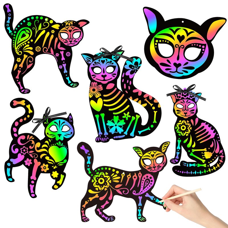• Day of The Dead Scratch Kit: The package contains 60pcs scratch cards (6 styles, 10 of each). It comes with many skeleton cat elements. And 20pcs wood sticks, 1 bundle of black ribbon. It is a special gift for kids to DIY your own unique skull cat scratch card.
