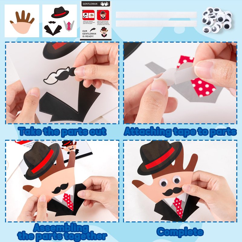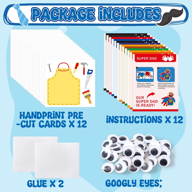 - Handprint Craft Set: This handprint art craft for children aged 3+ includes 12 pre-cut dad print cards, 12 instructions, 2 sheets of double sided tape, some eyes and a colorful gift box.
