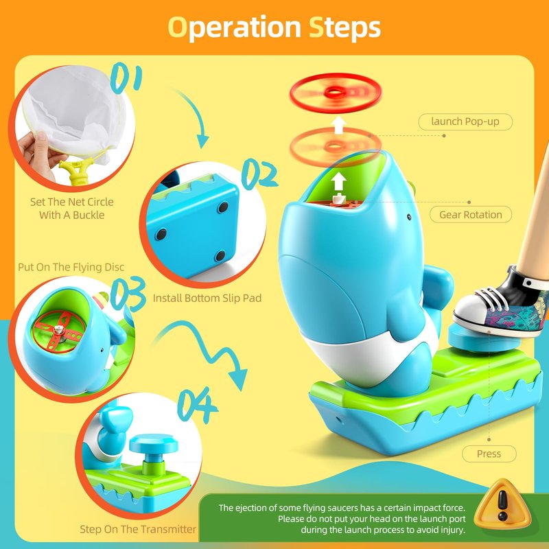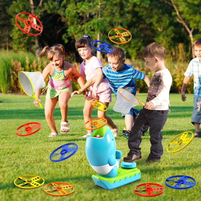 - Easy To Use: Just press on the pedal gently,the launcher port shoots the flying disc into the sky( can put 4 into it). The innovative design catching nets allow children to catch the flying disc mid-air, adding an exciting layer of challenge and fun to the game. Each successful catch fills them with delight, and this play-and-run activity not only fills their hearts with joy but also keeps their bodies fit and strong! Suitable outdoor outside game toys for kids boys toddler ages 3-5 4-8.